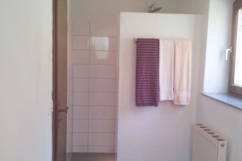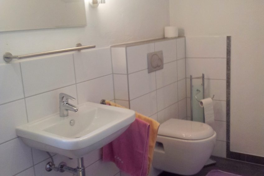 Beide Zimmer haben ein Badezimmer einer ebenerdigen Dusche bzw. mit einem sehr geringen Einstieg, Waschbecken und Toilette.